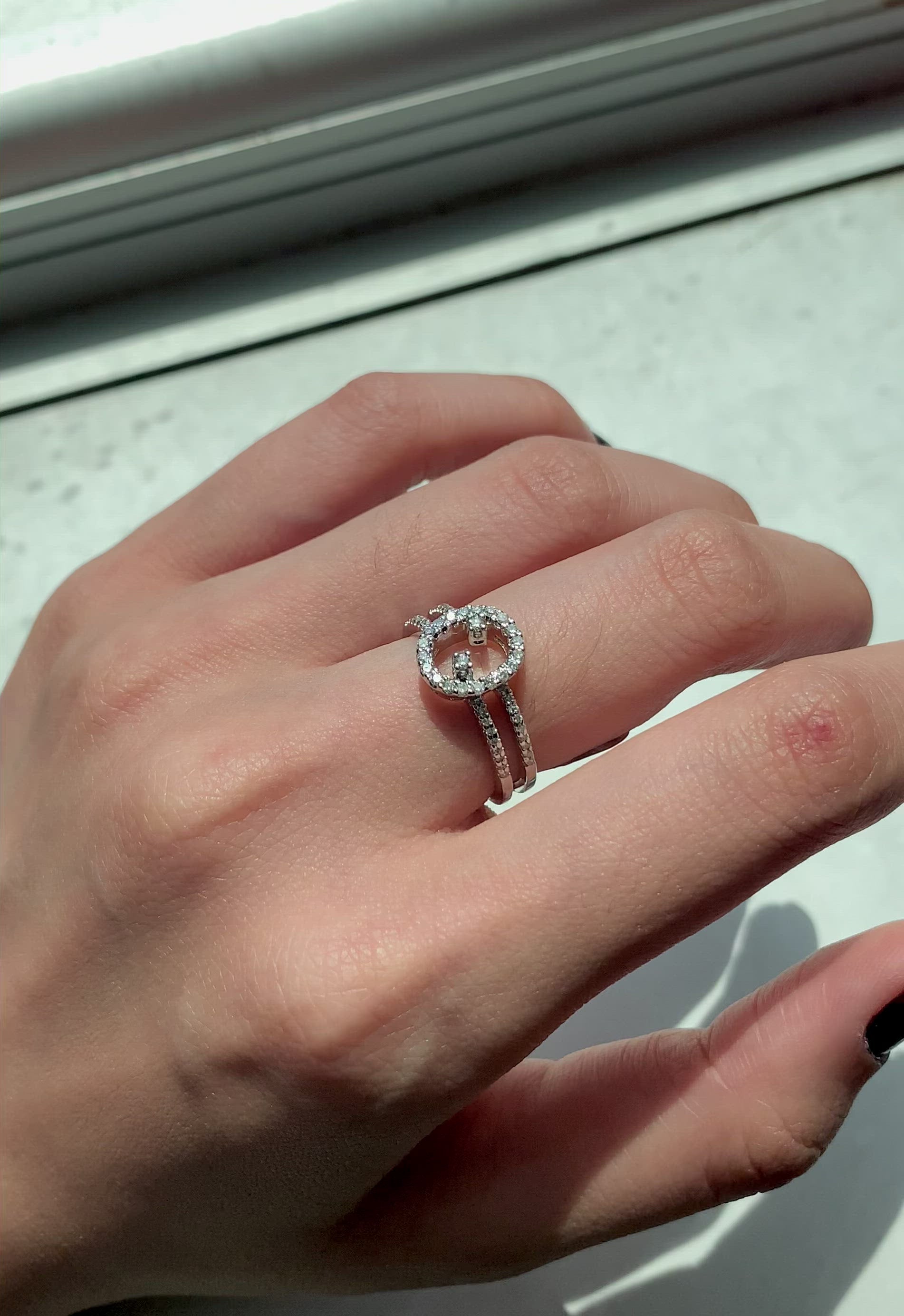 Deux diamants jumeaux accentuent également le centre de la bague de manière diagonale inclinée.