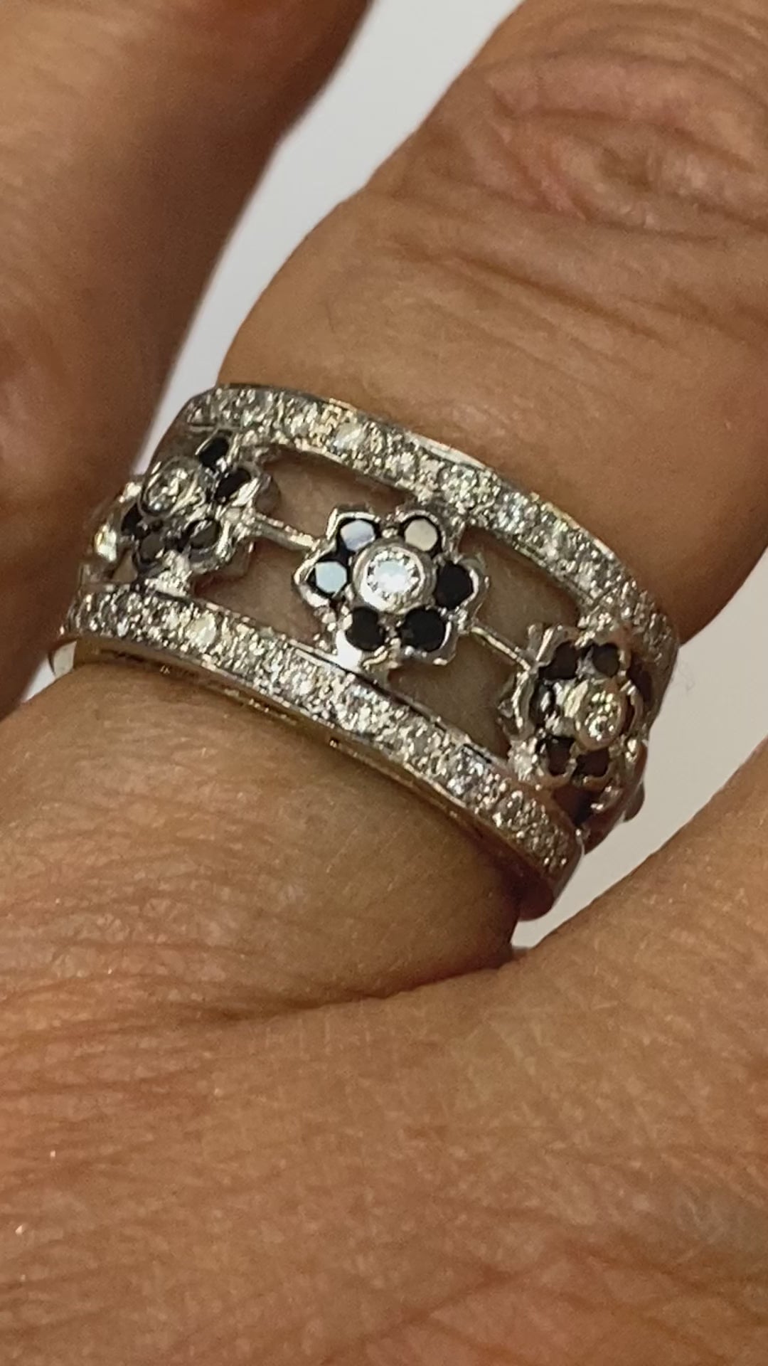 The Black and White Diamond Band Flower Design Ring 14K is exclusively handcrafted at our jewelry workshop located in Montreal. Only one in stock - ready to ship. For any inquiries regarding this exquisite piece, kindly reach out to us.: ✆ 1-800-263-2652 or Email.
