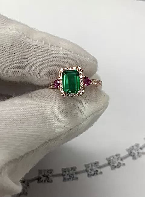 Designed in 14k Rose Gold, this Emerald cut Emerald and Ruby Halo Ring displays an extremely vivid range combination of colors.