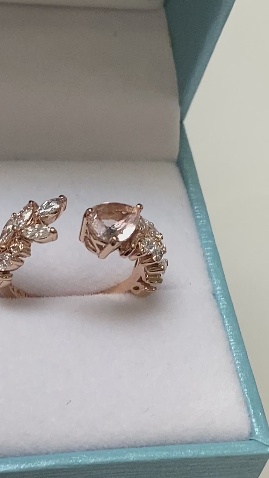 Custom-made to order, Inspired by the beauty of nature, this Morganite and Diamond Ring 14K Rose Gold, features a Sweeping Ivy and an asymmetrical open ring design.
