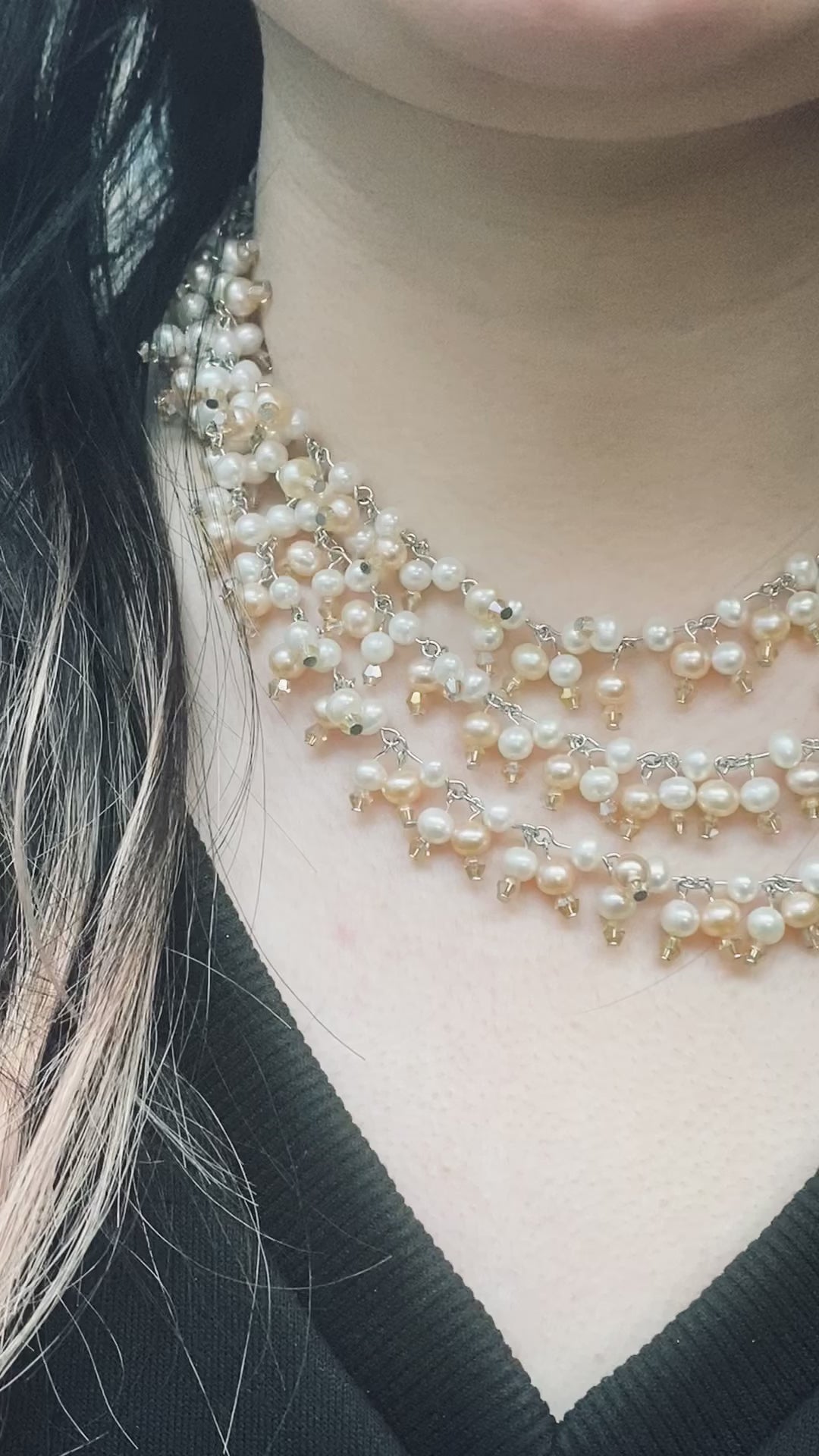 Luxury and Elegance in One, the Exquisite Multi-strand Freshwater Pearl Necklace with Rhinestones Accents is crafted with a sterling silver chain, boasting a charming combination of peach and cream pearls alongside champagne color briolette rhinestones.