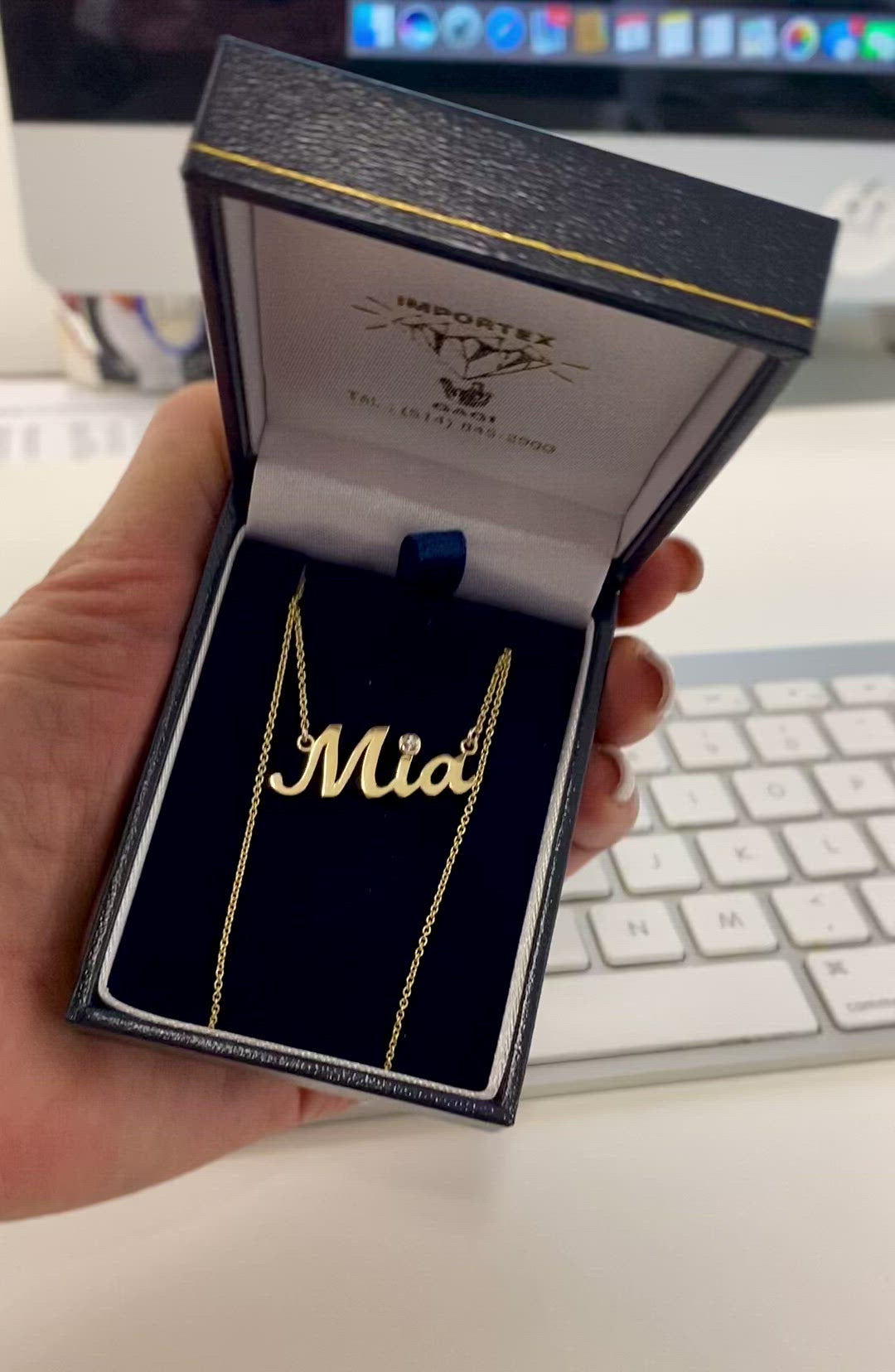 This Personalized Name Necklace Mia Diamond Accent Yellow Gold, is the perfect choice for gifting someone special. Crafted with striking yellow gold, it features a personalized name accompanied by a diamond accent. This necklace is sure to add a meaningful touch to your special occasion.
