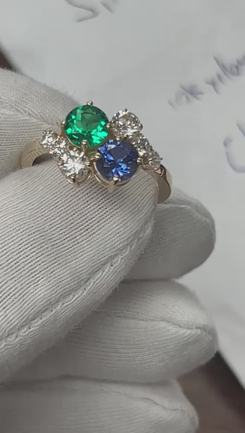 Meticulously handcrafted, the focal point of this customized ring features a captivating melding of a Vivid Green Emerald and a Medium Blue Sapphire, both lab-created gems harmoniously coming together.