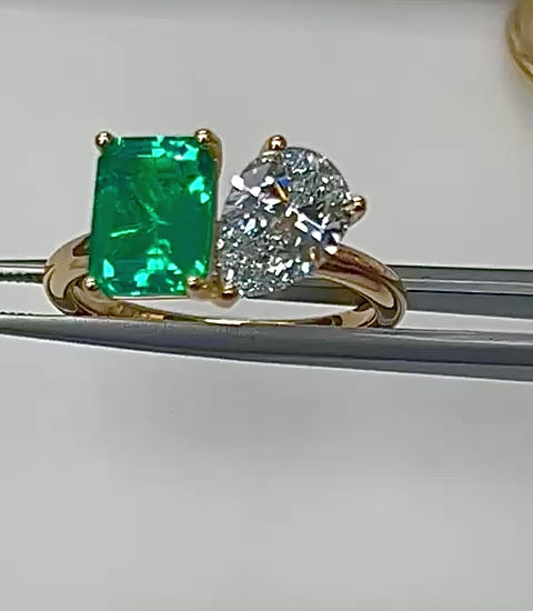The Toi Et Moi Ring Emerald And Diamond 18kt Yellow Gold is crafted with a stunning combination of 8X6mm Lab-Grown Green Emerald and 1-carat Pear Diamond set in 18kt Yellow Gold.